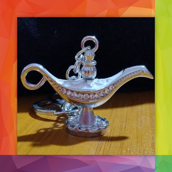 A stainless steel and enamel keyring, in the shape of Aladdin's lamp.