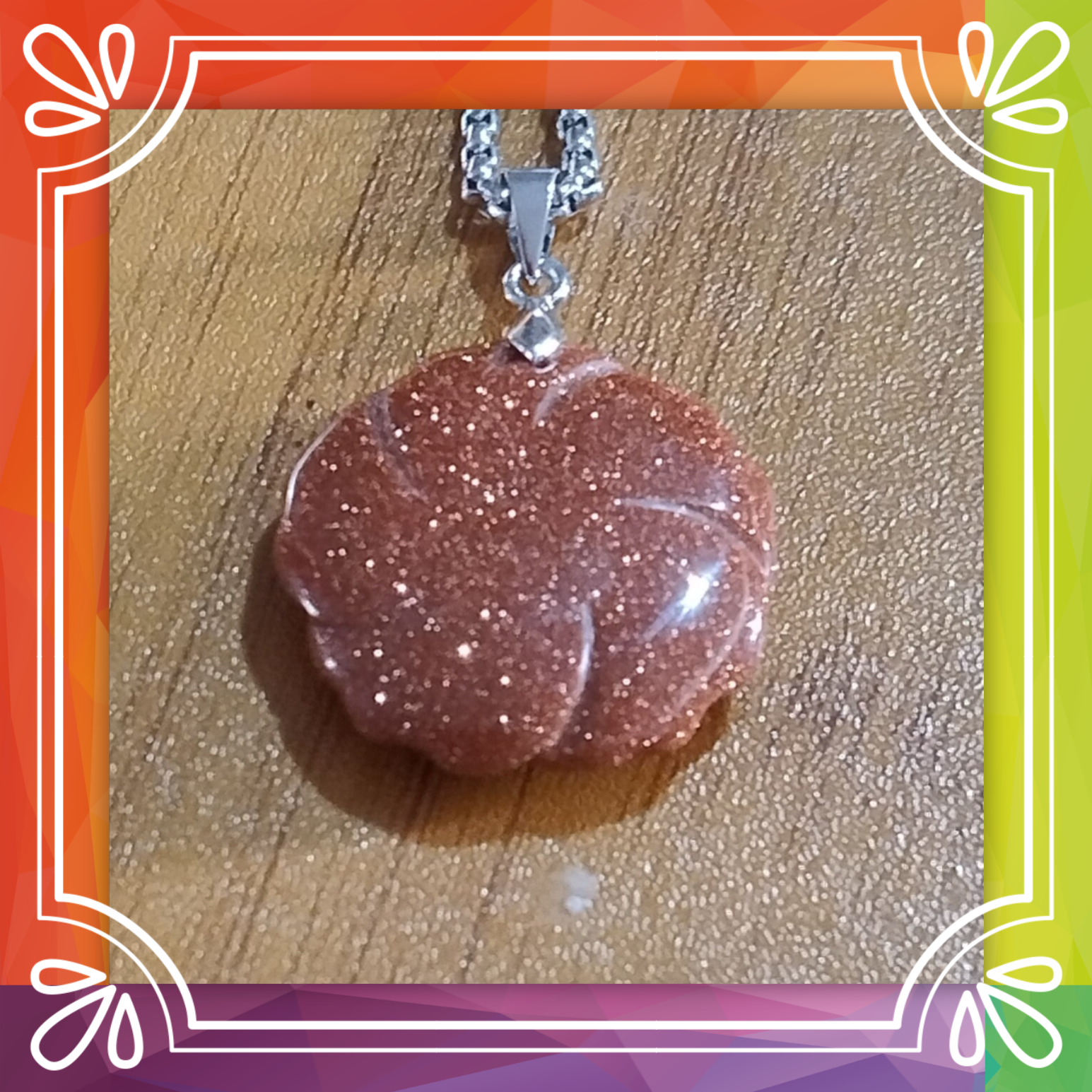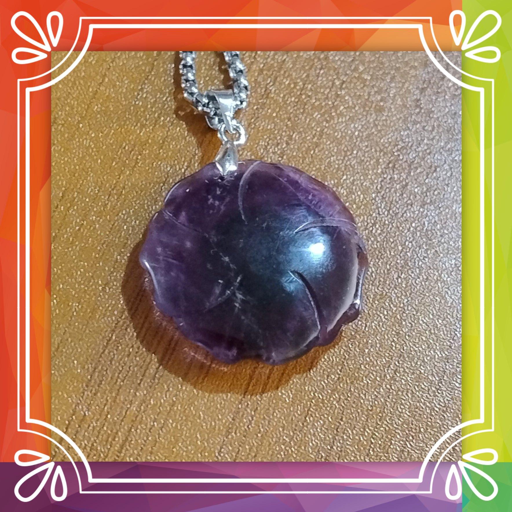 A real healing crystal, cut, shaped and polished into a rose shape, on a silver tone, 24 inch chain.