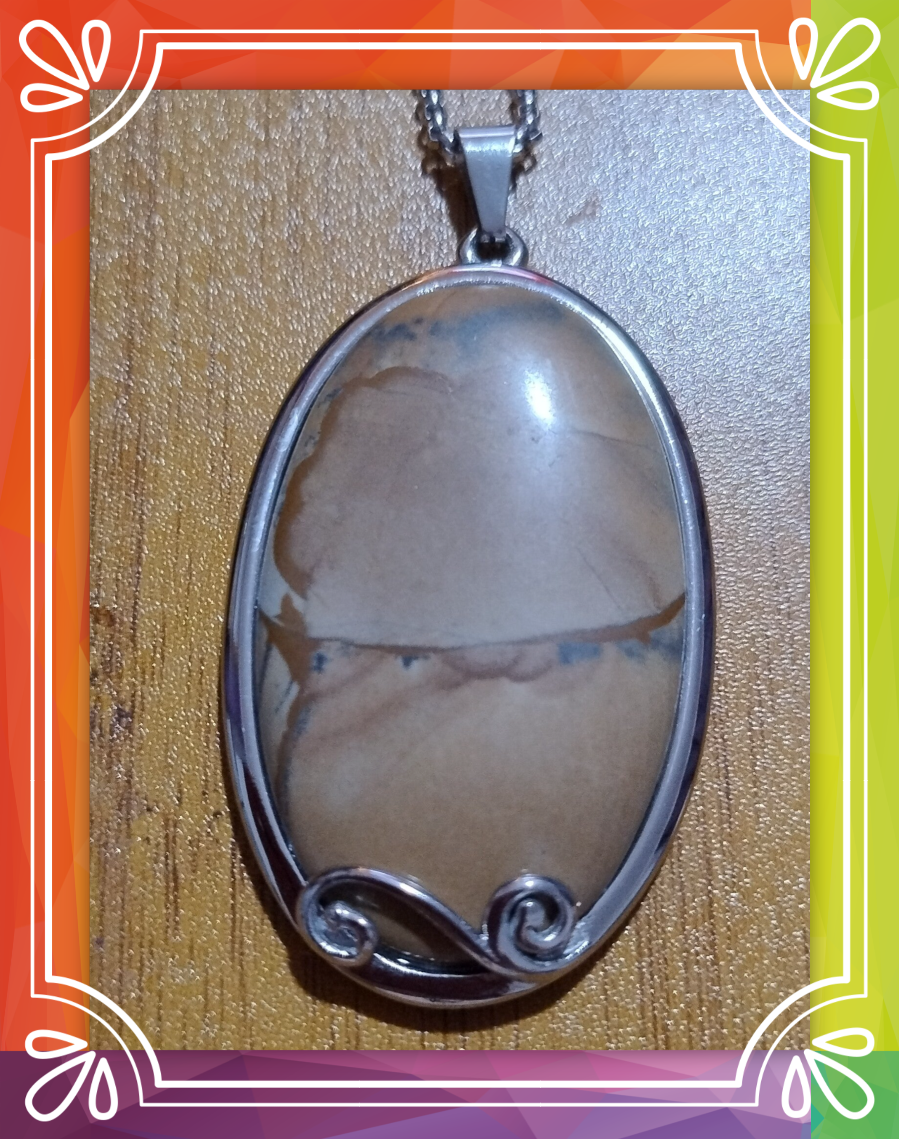 A real picture jasper healing stone, at in a silver tone bail, on a silver tone, 26 inch chain.