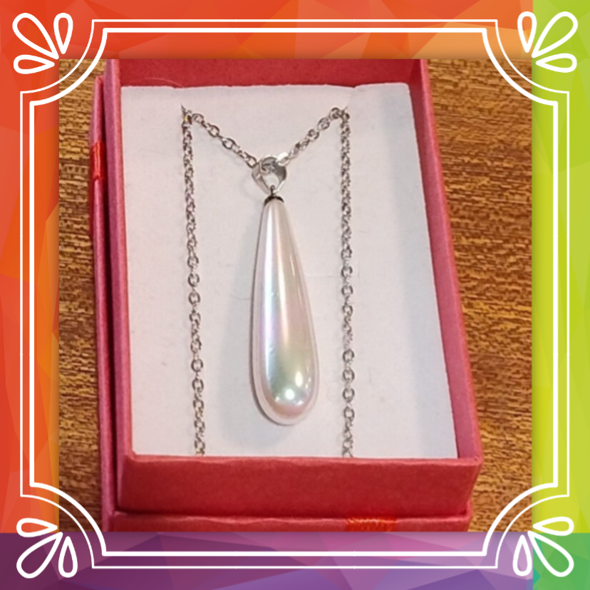 Artificial pearls in the shape of a tear drop, on a stainless steel bail and 18 inch chain. Comes in a gift box.