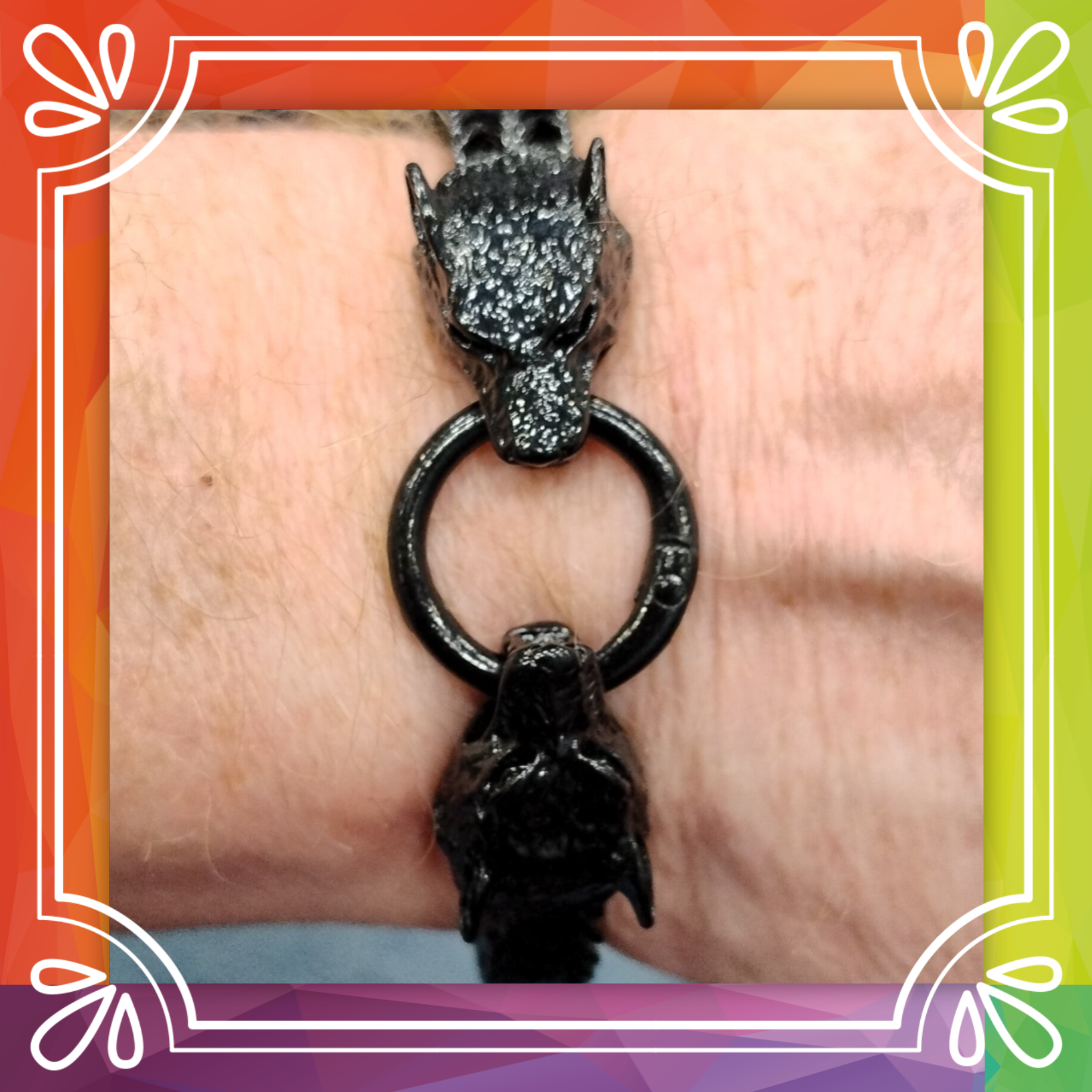A unisex stainless steel chain bracelet adorned with two wolves heads and a easy circular clasp.