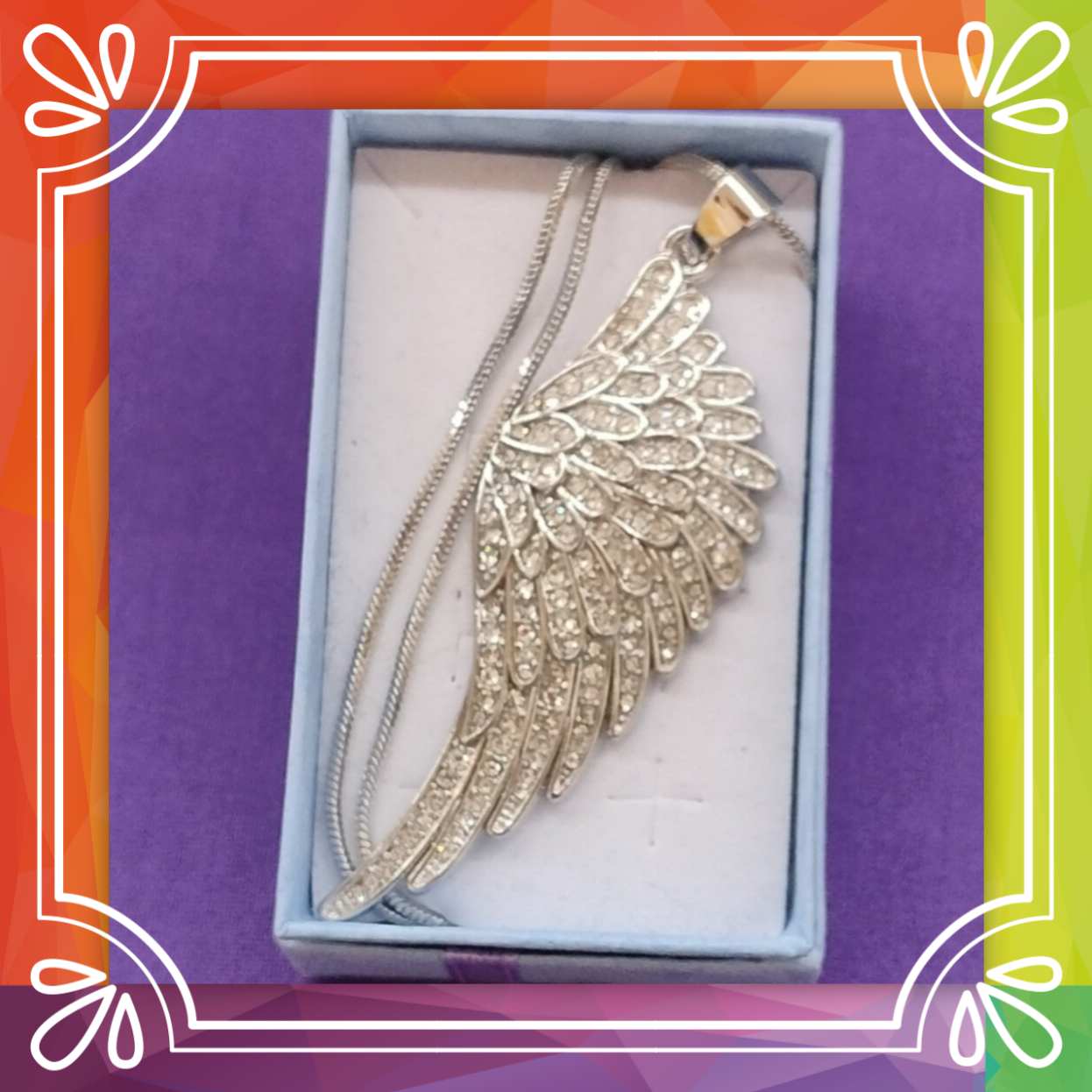 A stainless steel angel wing shaped pendant, adorned with Austrian crystal, on a 24 inch stainless steel chain. Comes in a gift box.