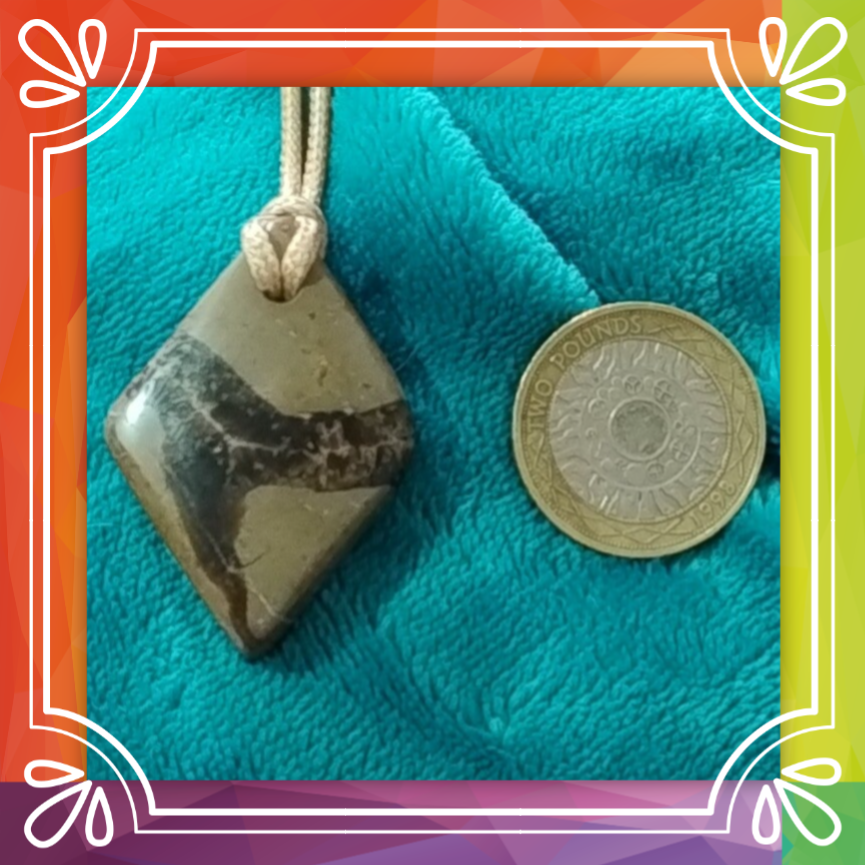 A real piece of septarian crystal, hand cut, polished and shaped into a diamond design, then hand drilled and put onto a thong style necklace.