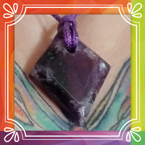 A real fluorite crystal, hand cut, polished and shaped into a diamond design, then hand drilled and put onto a thong style necklace.