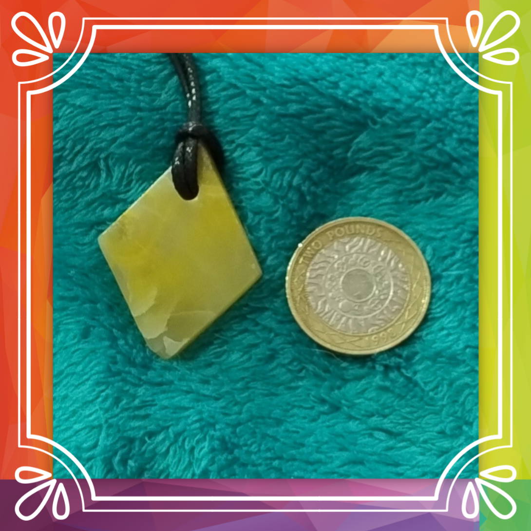 A real piece of bumble bee jasper, hand cut, polished and designed into a diamond shape, then hand drilled and put onto a yellow thong style necklace.
