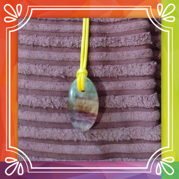 A real piece of candy Fluorite, cut, drilled and polished, by hand, into a gorgeous oval shape, on a yellow thong style necklace.