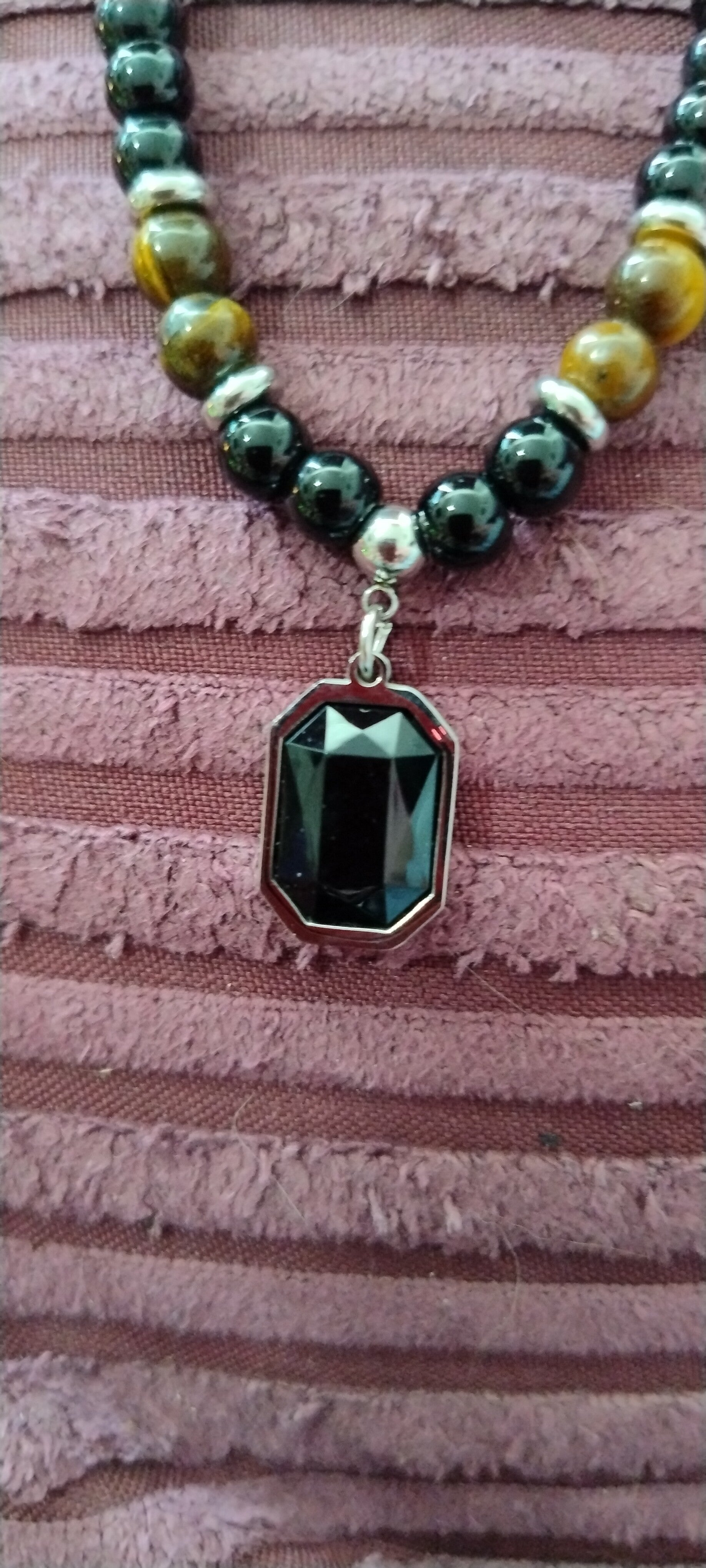 Real black obsidian and yellow tigers eye healing crystals, strung onto beading string, with a black obsidian pendant, and a stainless steel clasp.