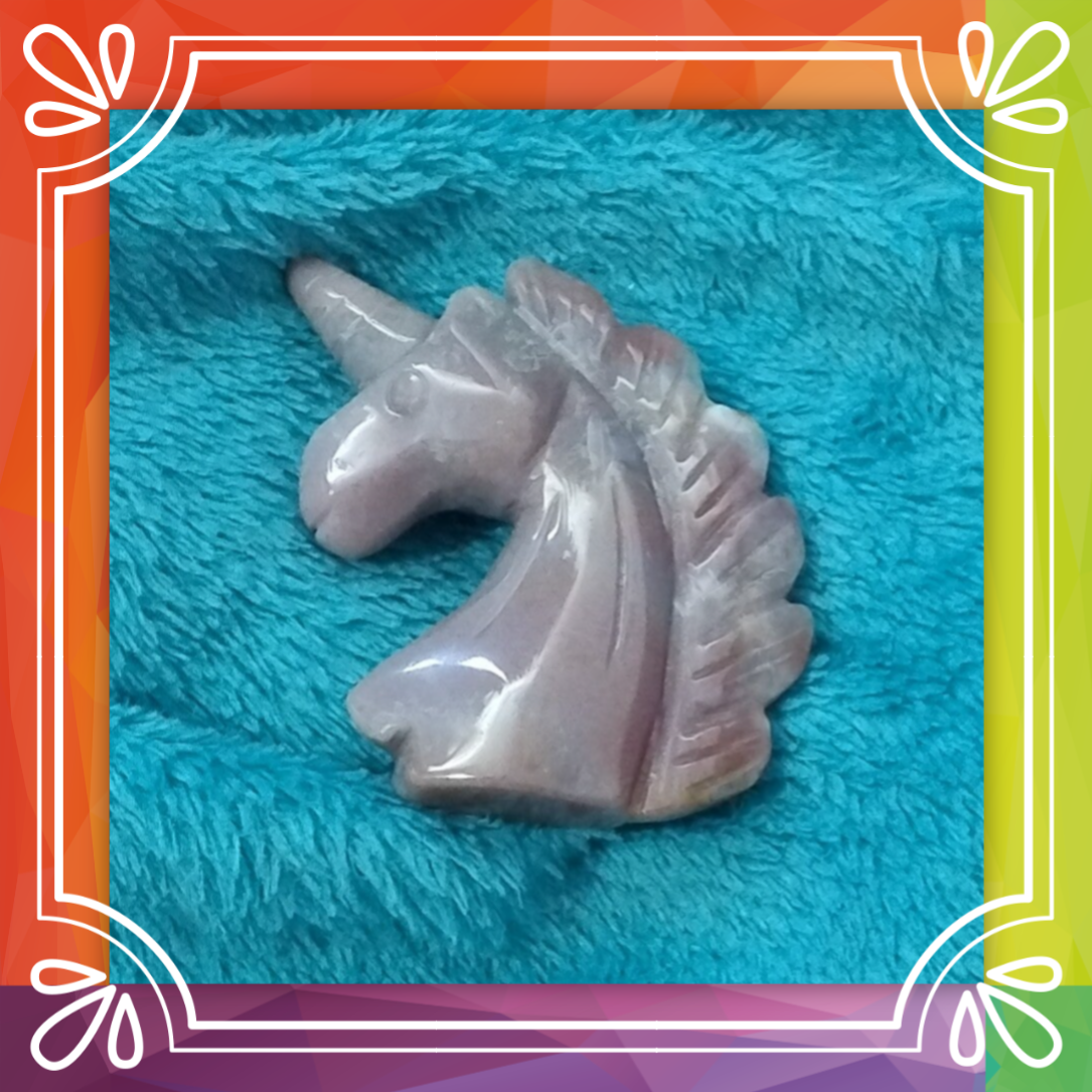 A real piece of crystal, cut and polished into a beautiful unicorn's head shape.